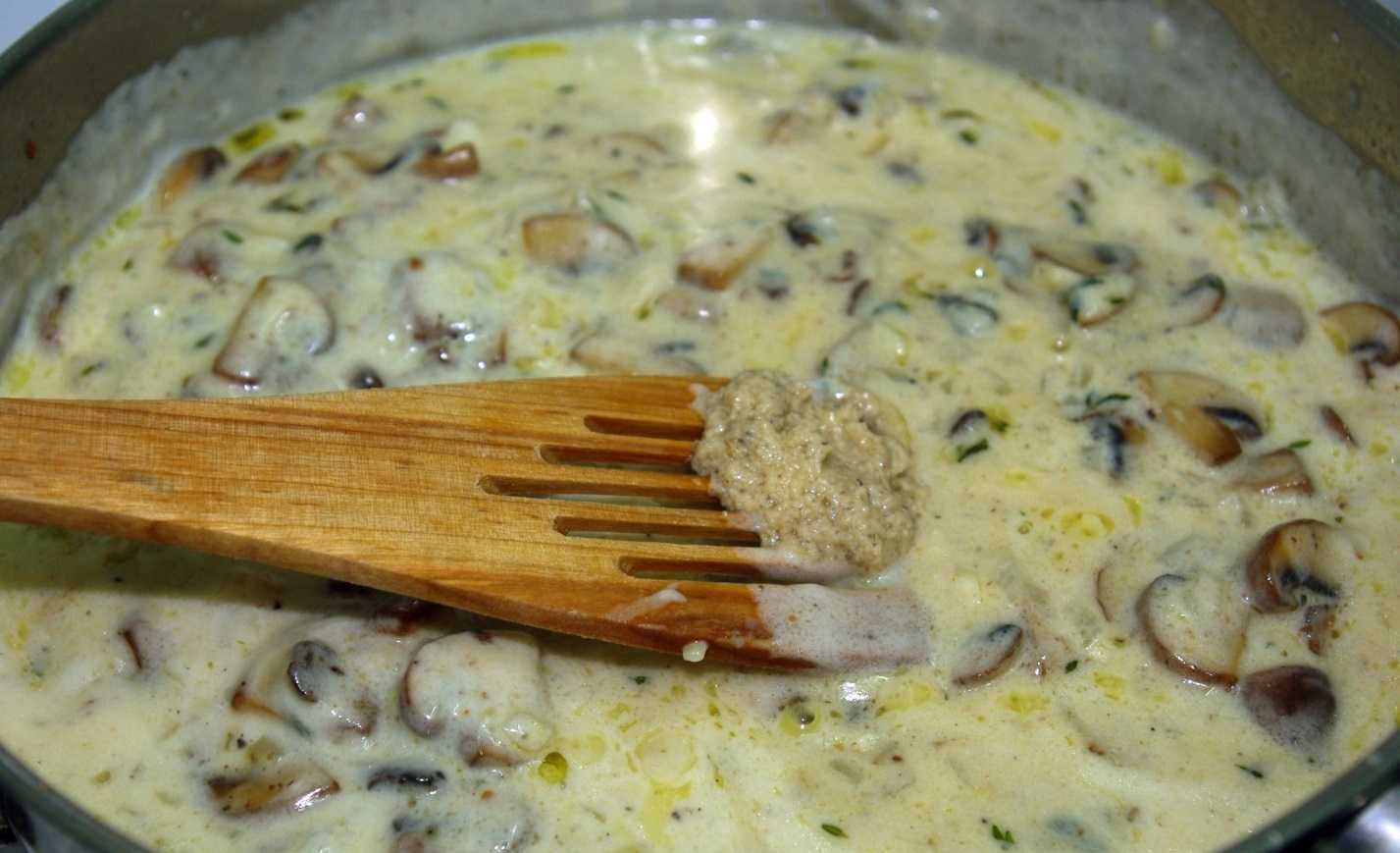 Основой для белого грибного соуса послужит сливочное масло: именно благодаря ему подливка будет такой нежной. Если вы хотите немного снизить жирность соуса, можете заменить сливочное масло растительным, но это отразится на вкусе: будет не так ароматно и нежно. К тому же, калорийность в итоге уменьшится незначительно, так что лучше оставить сливочное масло в основе рецепта. Далее используется жидкая база: это может быть сметана или сливки. Оба варианта хороши, тут – дело вкуса. Кому-то больше нравится вариант на сметане, кто-то предпочитает именно сливочную подливку. Попробуйте оба варианта, чтобы выбрать идеальный для себя!