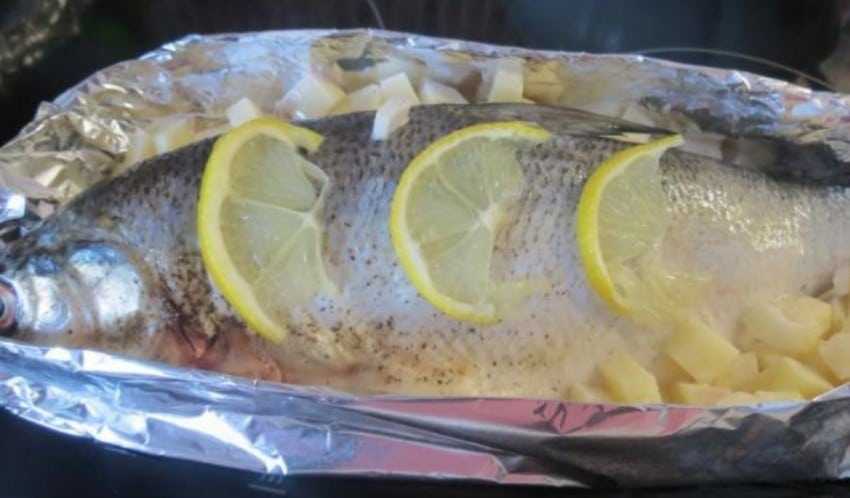 - Плотно обернуть рыбную тушку фольгой, отправить в прогретую до 200 С духовку.