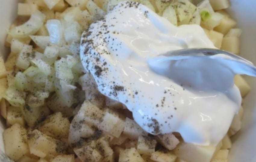 - Рыбу порезать на порционные кусочки, картофель — тонкими кружочками, лук — кольцами или полукольцами. Сыр и сливки перемешать;