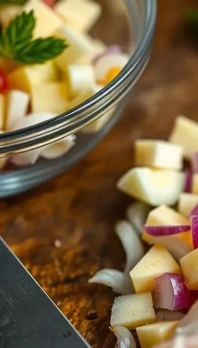 - Подготовка лука: Лук мелко нарезать. Если лук слишком острый, его можно замариновать в уксусе или лимонном соке на 10-15 минут.