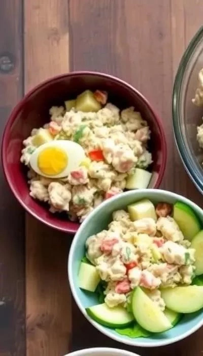 - Салат с тунцом, яйцом и яблоком: Добавьте 1/2 яблока, нарезанного кубиками.