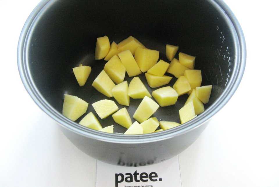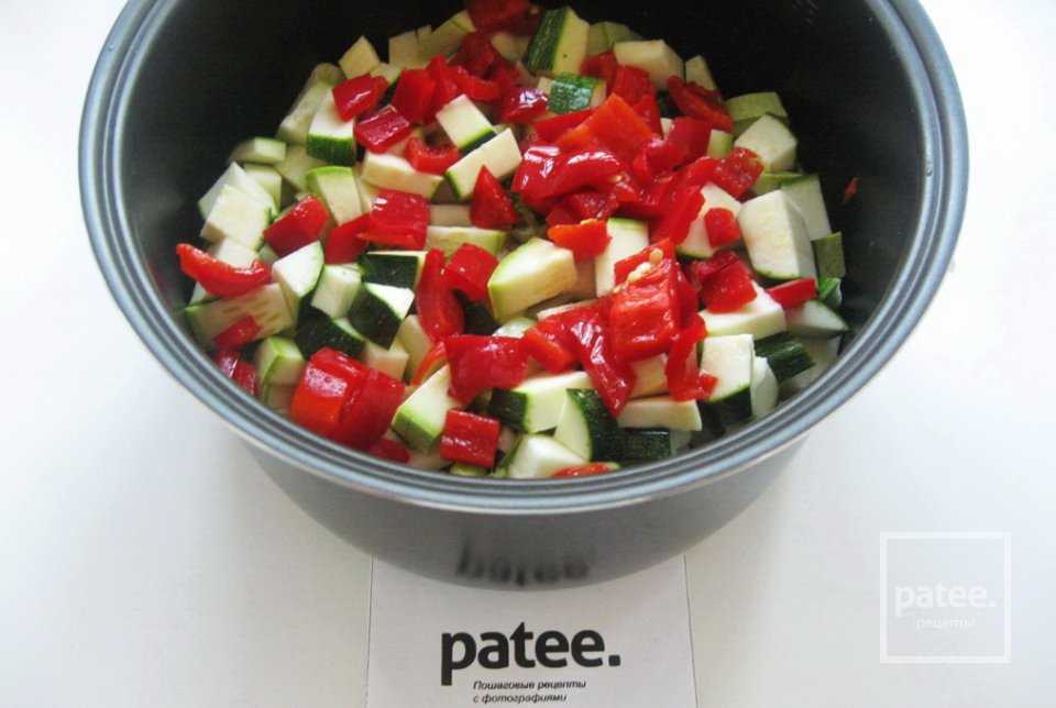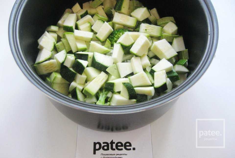 Цукини также нарезаем кубиками и кладем в мультиварку.