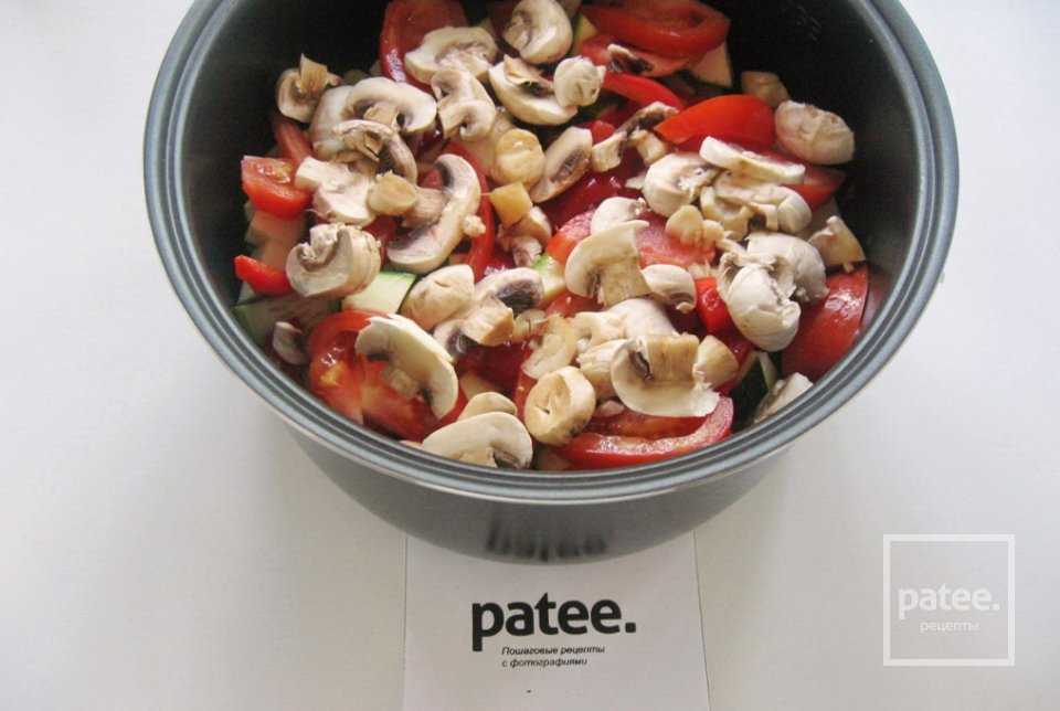 Наконец овощи все порезаны. Наливаем растительное масло(у меня оливковое), солим и перчим по вкусу. Овощи пустят сок, но можно налить совсем немного воды. Ставим кастрюлю в мультиварку. Включаем режим “Тушение”.