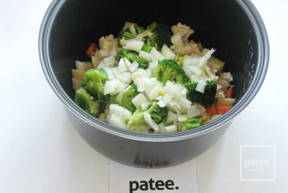 Затем мелко режем репчатый лук. Кладем в кастрюлю, а также брокколи.