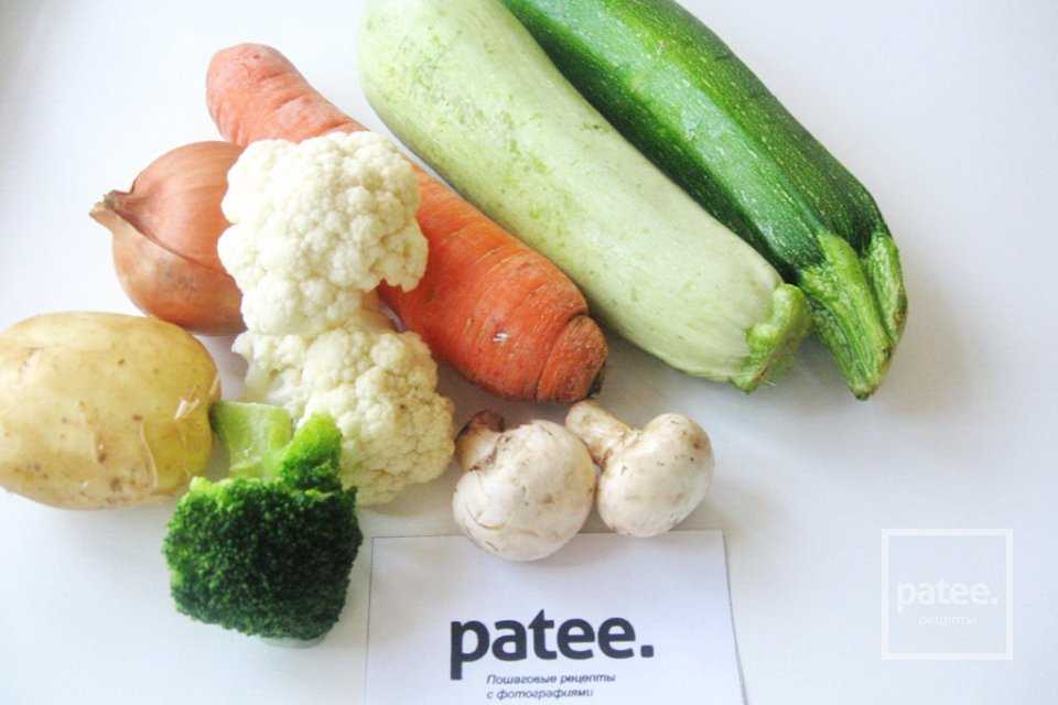Для приготовления овощного рагу в мультиварке нужно взять любые овощи. У меня были: лук репчатый, морковь, брокколи, цветная капуста, кабачок, цукини, картофель, шампиньоны.