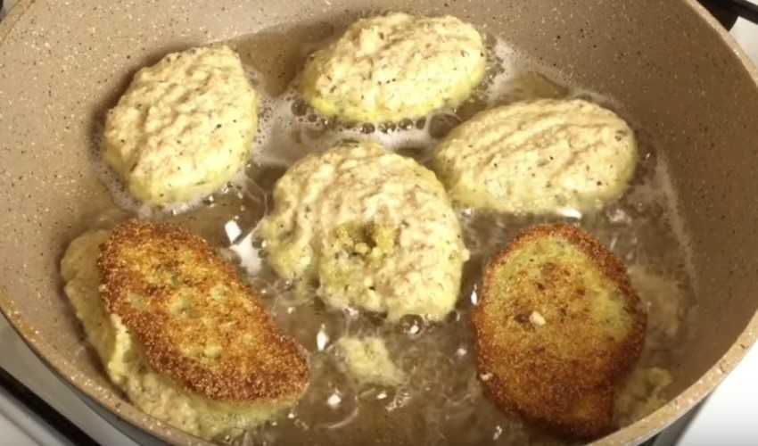 - Из массы скатать шарики, сплюснуть с двух сторон, обвалять в сухарях, обжарить на растительном масле на сковороде. Излишки жира убрать бумажной салфеткой.