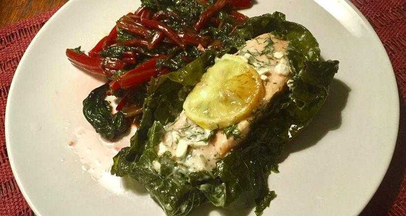 Листья разложить так, чтобы они перекрывали друг друга. Окуня морского поперчить, если листья несоленые – посолить. На них поместить полутушку, сверху – пластинки лимона, завернуть в листья, смазать маслом и запекать на гриле по 8 минут с каждой стороны.