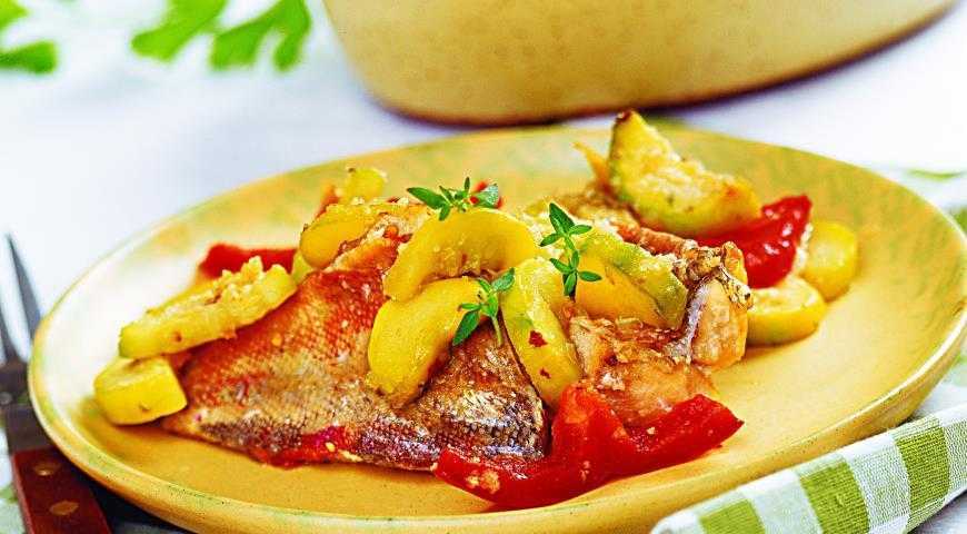 Морской окунь в духовке с картошкой, луком, шампиньонами