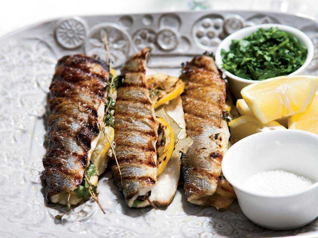 Когда все готово, рыбу выкладывают на решетку, смазанную маслом, и готовят по 5 минут с каждой стороны, не допуская открытого пламени. Снимают рыбку сразу, пока она не пристала к решетке.