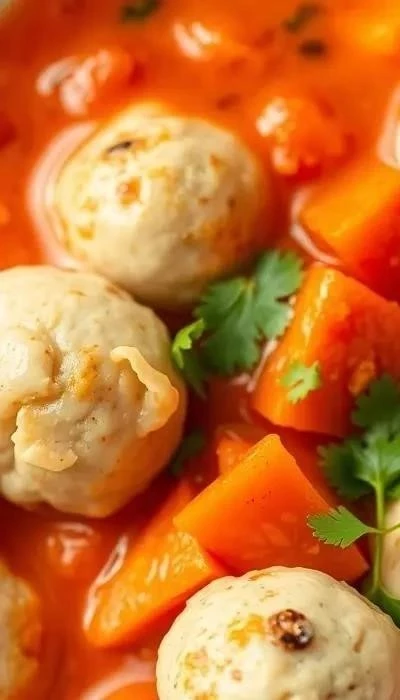 Ингредиенты: 500г рыбного фарша, 1 яйцо, 1 ст.л. кокосовой стружки, соль, перец, кокосовое молоко, томатная паста, лук, имбирь, чеснок, чили перец. Приготовление: Смешайте фарш, яйцо, кокосовую стружку, соль и перец. Сформируйте шарики и обжарьте их до золотистой корочки. Приготовьте соус из кокосового молока, томатной пасты, обжаренных лука, имбиря, чеснока и чили перца. Залейте шарики соусом и тушите до готовности.