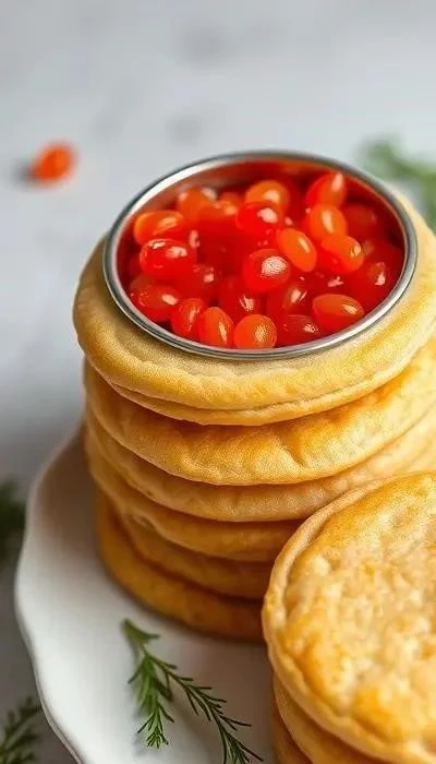 - Башенки: Сверните блины в трубочки и выложите их в виде башенки, украсив икрой и зеленью.