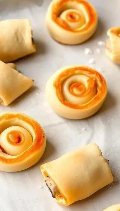 - Формирование рулетиков: Свернуть полоски теста в рулетики. Выложить рулетики на противень, застеленный пергаментной бумагой.