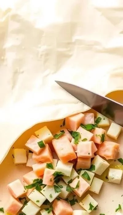 - Овощи: Добавьте в начинку нарезанные кубиками огурцы, помидоры, болгарский перец или маринованные огурчики.