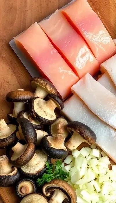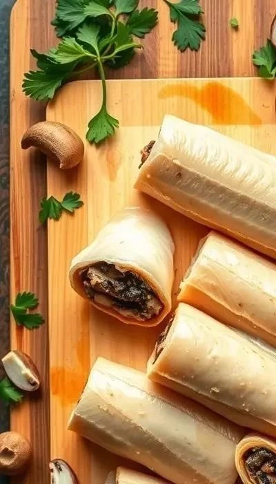 - Формирование рулетов: На пищевую пленку выложите рыбный фарш, распределите его ровным слоем. Сверху выложите грибную начинку. Аккуратно сверните рулет, плотно прижимая его. Заверните рулет в пищевую пленку и отправьте в холодильник на 30 минут для стабилизации.