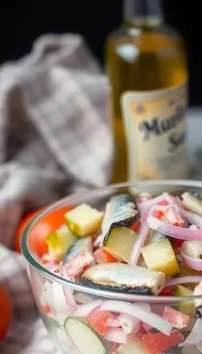 - Смешивание ингредиентов: В миске соедините нарезанную сельдь и лук.