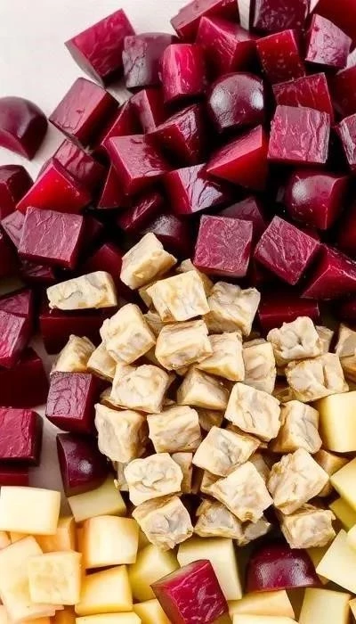 - Салат с сельдью и картофелем: Добавьте 2 отварных картофелины, нарезанные кубиками.