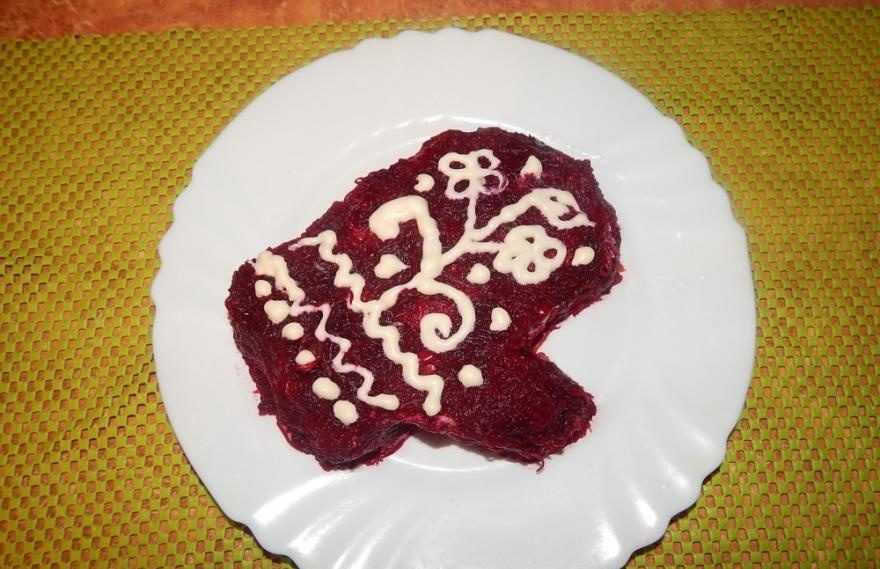 А затем, не добавляя майонез, расположите самым верхним слоем тертую свеклу, сдобрив ее хорошей плотной порцией майонеза. Верхний майонезный слой обязательно хорошенько разгладьте, чтобы салат выглядел красиво.