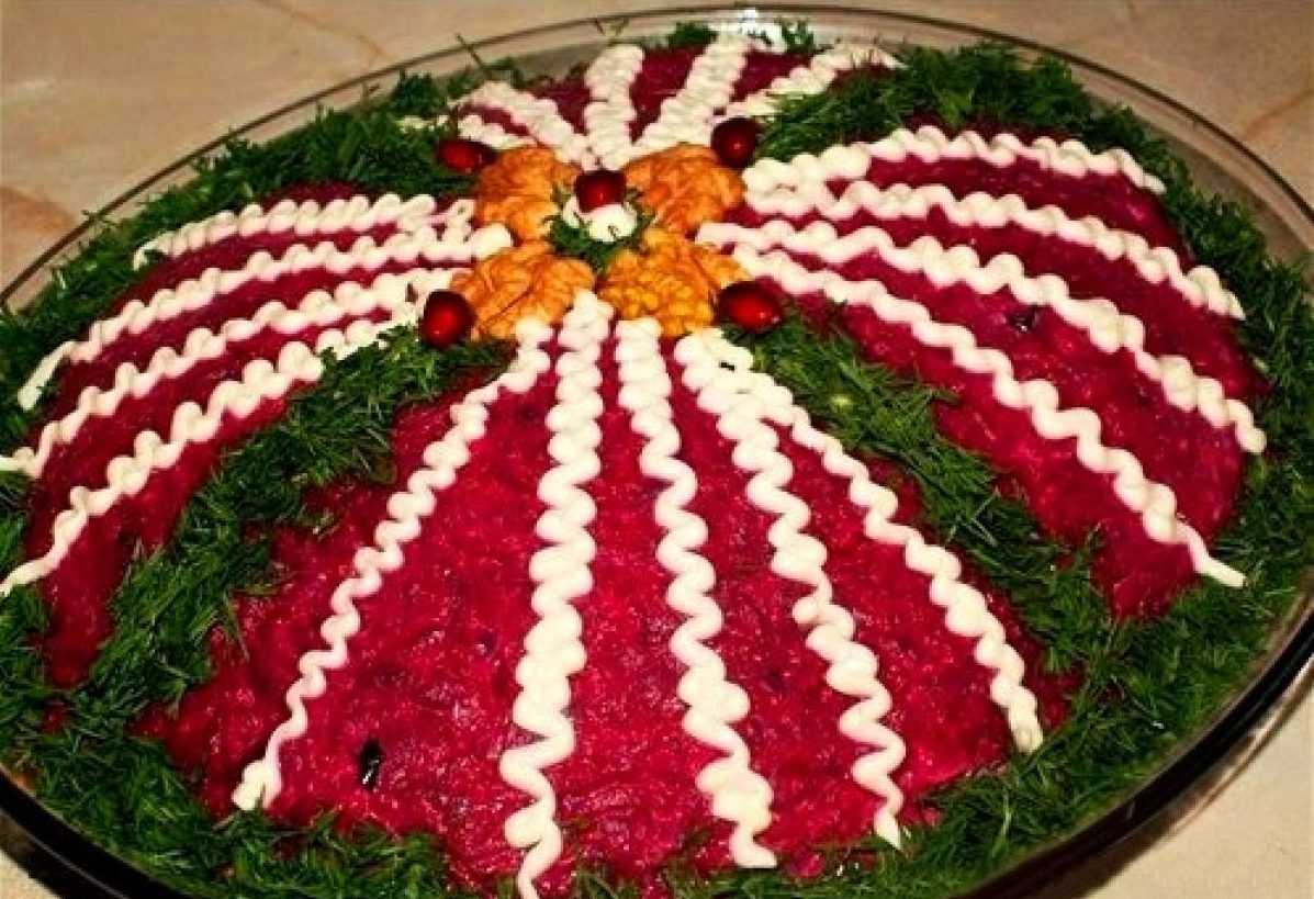 - Если Вы украшаете салат селедка под шубой другими овощами или фруктами, то делать это нужно непосредственно перед подачей на стол. Иначе свекла может покрасить все что сверху.