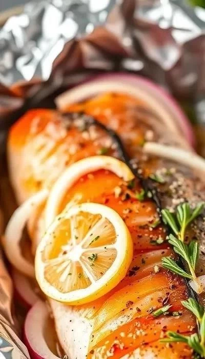 - Аккуратно разверните фольгу и проверьте готовность рыбы вилкой.