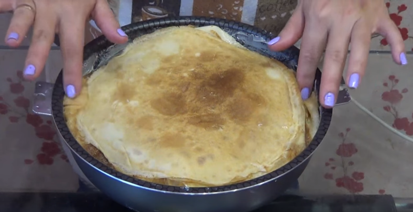 когда выливаете тесто на сковородку, должен быть слышен звук, напоминающий шум моря. Если слышен звонкий треск, это значит что сковородка для блинов слишком горячая, и нужно срочно убавить огонь.