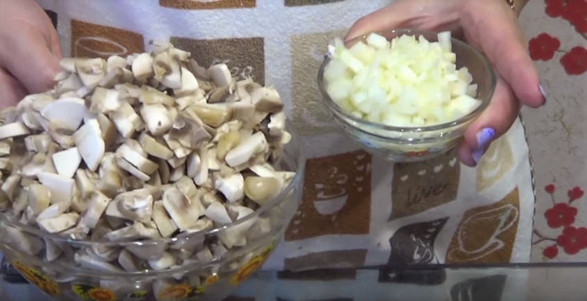 3. Для второй начинки мелко нарезаем лук и грибы.