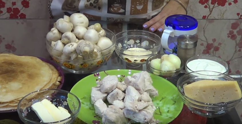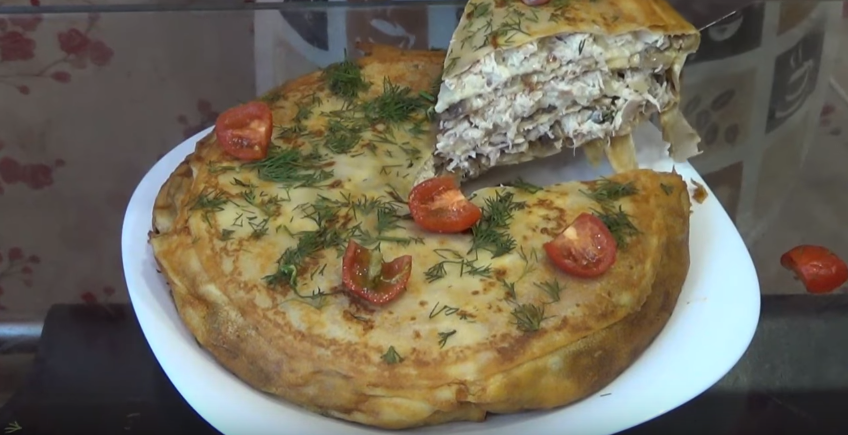 Блинный пирог с куриным филе, шампиньонами и сыром в духовке