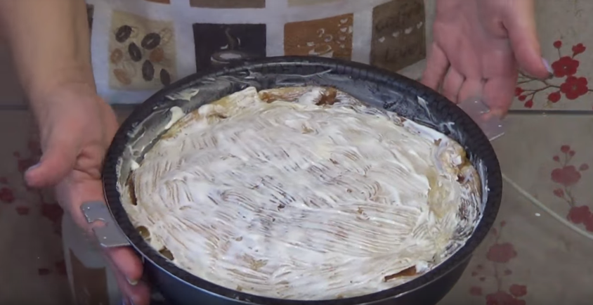 12. Смазываем верх сметаной и отправляем пирог в духовку, разогретую до 180 градусов на 20 минут, чтобы сыр расплавился.
