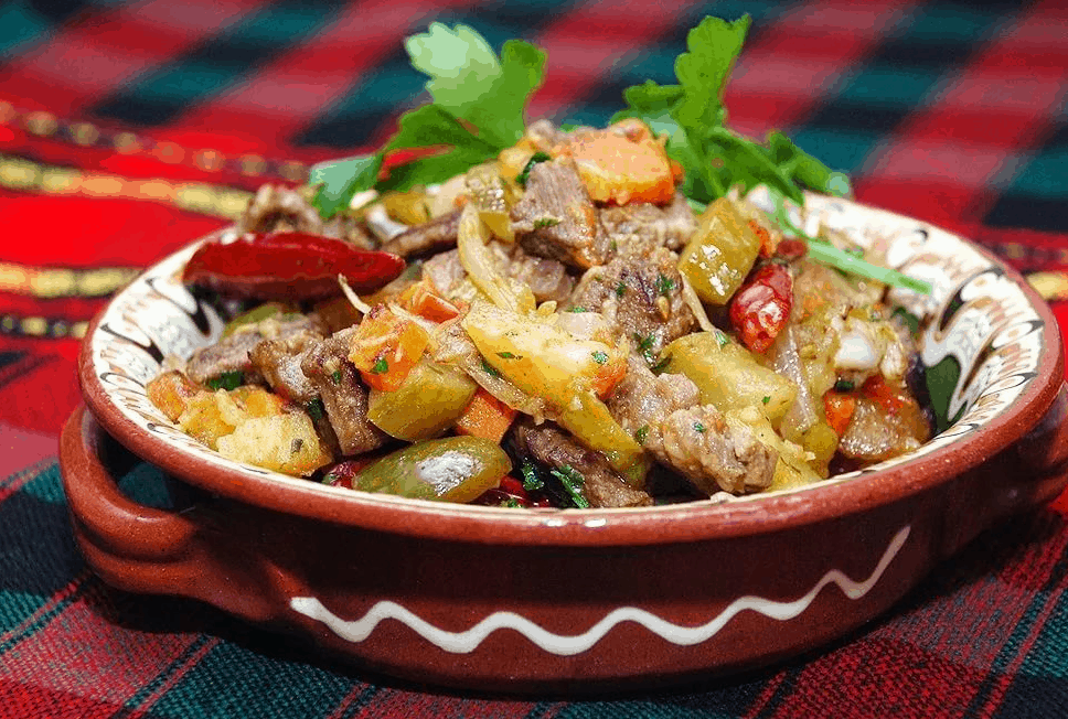 Азу является классическим блюдом татарской кухни. Оно представляет из себя жаренные кусочки мяса, в остром соусе с тушеными томатами, картофелем и луком.