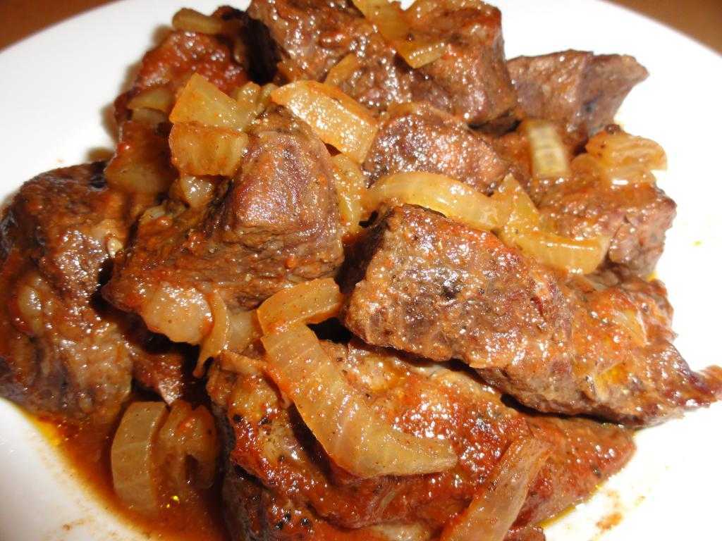 Приготовление: Нарежь лук полукольцами и обжарь до золотистости, а потом добавь тертую морковь, чеснок, томатную пасту и рубленые помидоры со специями. Говядину нарежь порционными кусками толщиной до 1,5 см и обваляй в муке. Слегка обжарь мясо и выложи в форму, залей соусом и отправь на 40-50 минут в духовку при 180 градусах, а потом оставь еще на час при 160 градусах.
