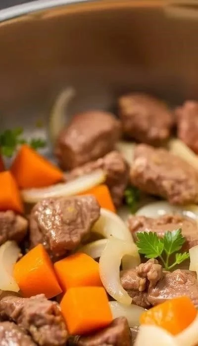 - Тушение мяса: Вернуть говядину в сковороду с соусом, перемешать и тушить на медленном огне 15-20 минут, пока мясо не станет мягким.