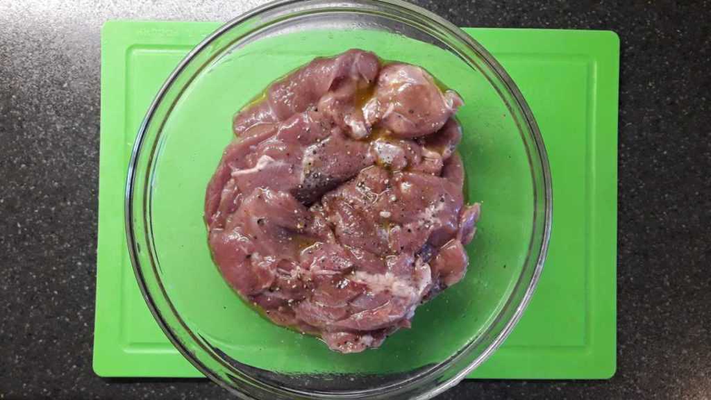 4. Смазываем каждый кусочек оливковым маслом, складываем в миску и оставляем минимум на час, а если дольше – еще лучше, промариноваться при комнатной температуре. Можно замариновать на ночь и оставить в холодильнике.