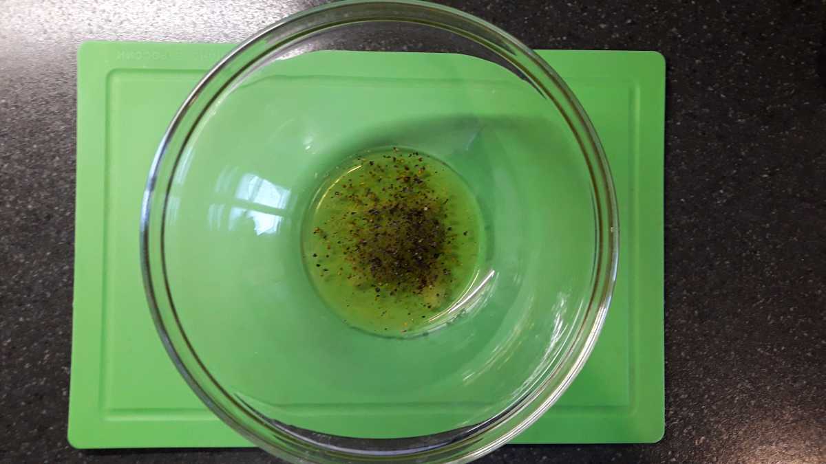 Приготовьте маринад, смешав оливковое масло с перцовой смесью и солью