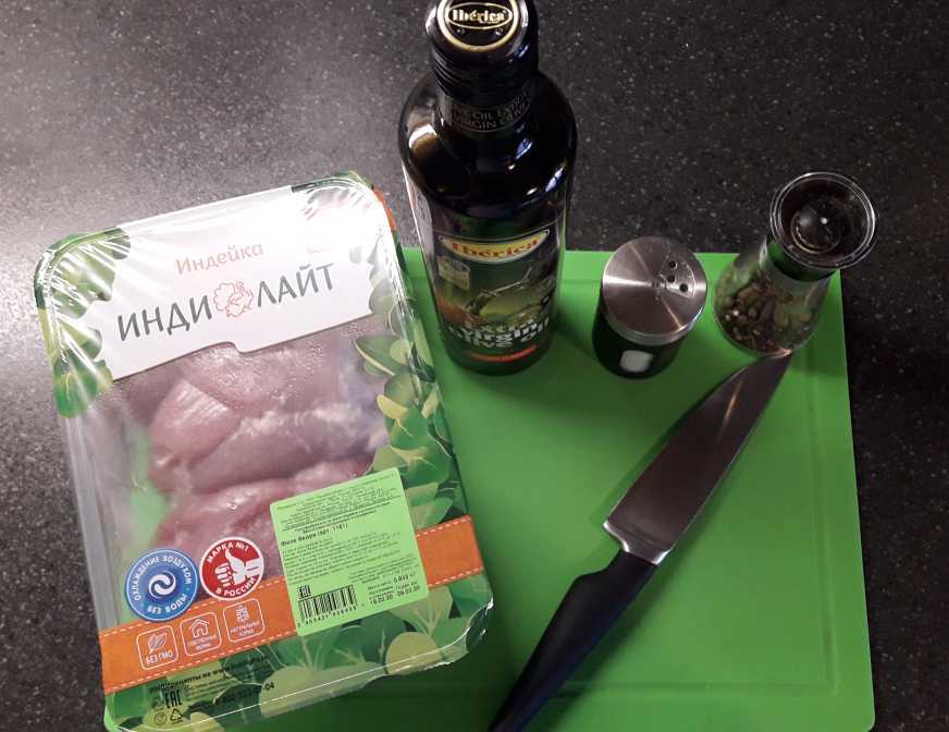 Для приготовления диетического варианта блюда выбираем постное филе грудки без костей, жил, кожи, жира. Кусок подготовленного филе разрезаем на поперечные кусочки, чтобы готовые ломтики получились мягкими. Полученные тонкие ломтики можно аккуратно отбить. Для нежности, обогащения вкуса маринуем кусочки птицы полчаса-час в смеси лимонного сока и рафинированного оливкового масла. Лимонный сок можно заменить другими маринадами по вкусу. Индюшиное мясо имеет нейтральный вкус, гармонично принимая ароматы. Этой же цели служит добавление различных пряностей, приправ. Мы чаще всего добавляем черный молотый перец, кориандр (зерна кинзы), рубленый чеснок.