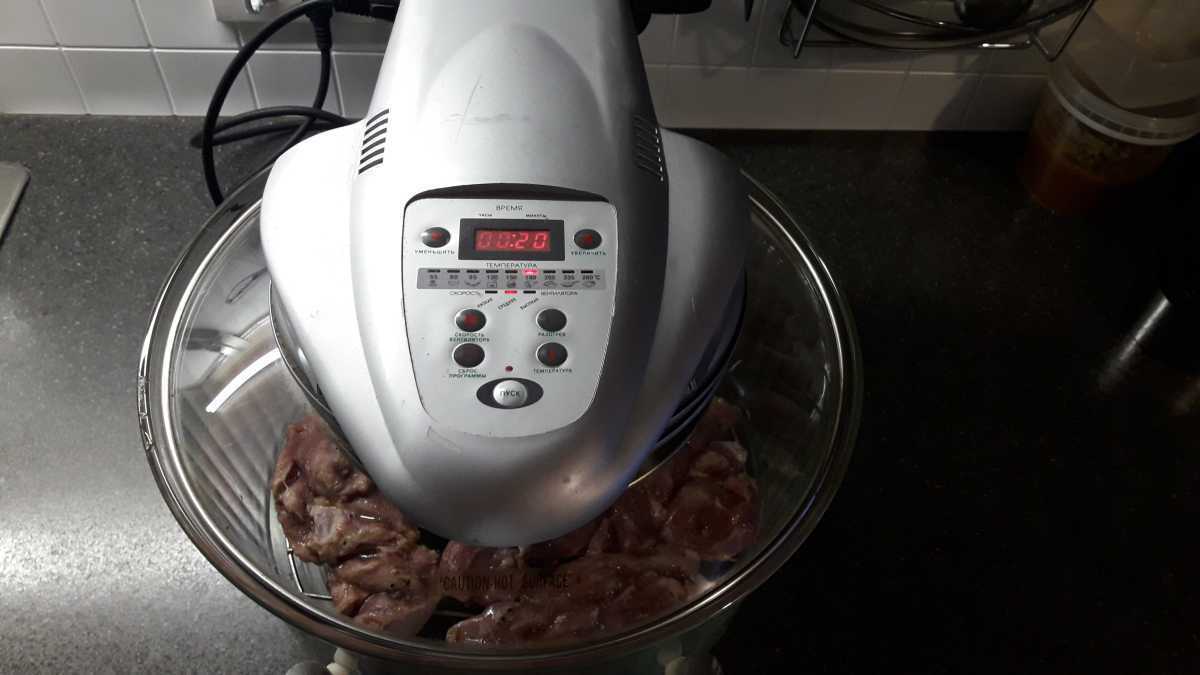 Разместите мясо на решетке аэрогриля и осторожно поместите решетку в аэрогриль, стараясь не обжечься об стенки