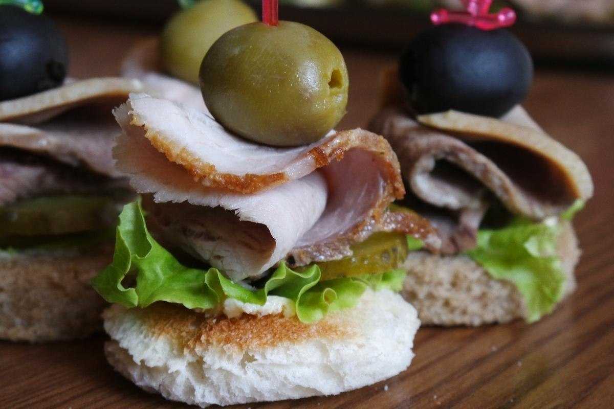 - Сверху такие канапе с сыром и ветчиной в домашних условиях можно дополнить оливкой, кружочком огурчика маринованного или половинкой помидора черри. В качестве дополнительного ингредиента можно использовать листик салата, а также различные мясные деликатесы.