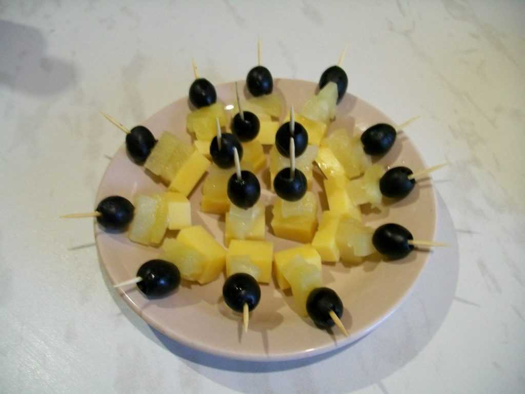 Очень часто в канапе на шпажках на праздничный стол встречается сыр. Потому отдельно поговорим о таких маленьких, но сытных закусках. Да и в рецептах, описанных выше, уже были такие закуски с сыром.