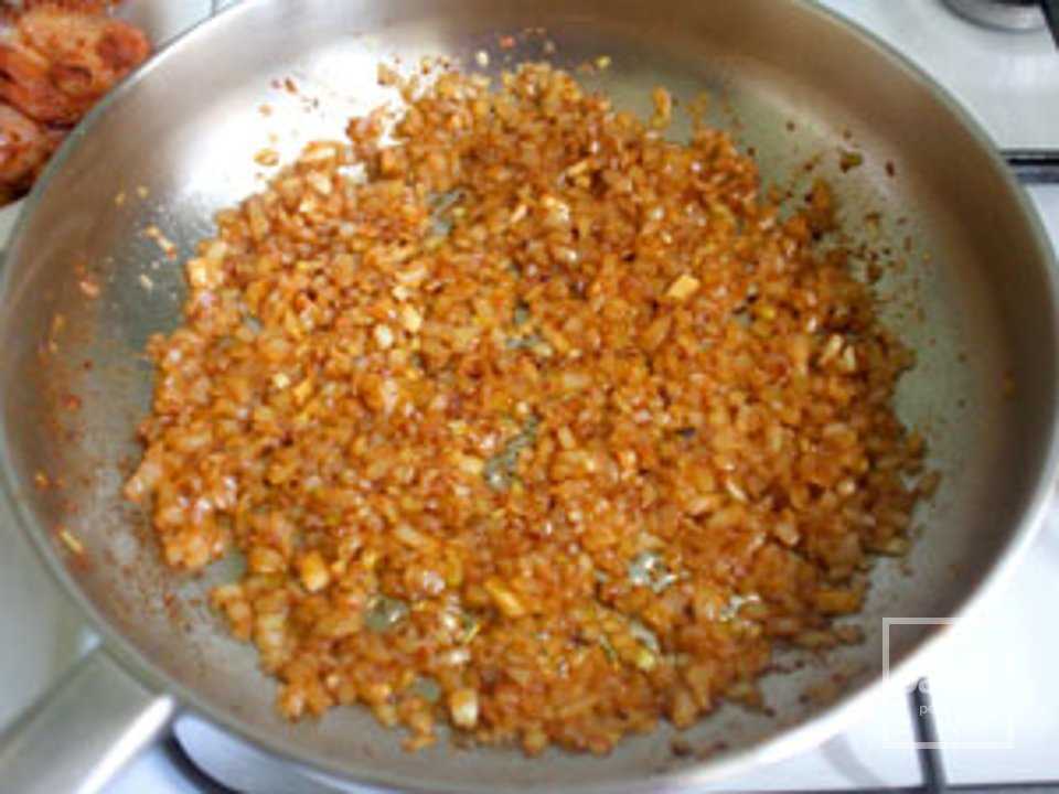 В сковороду, где жарилась курица, выложить лук. Помешивая, жарить до прозрачного состояния.