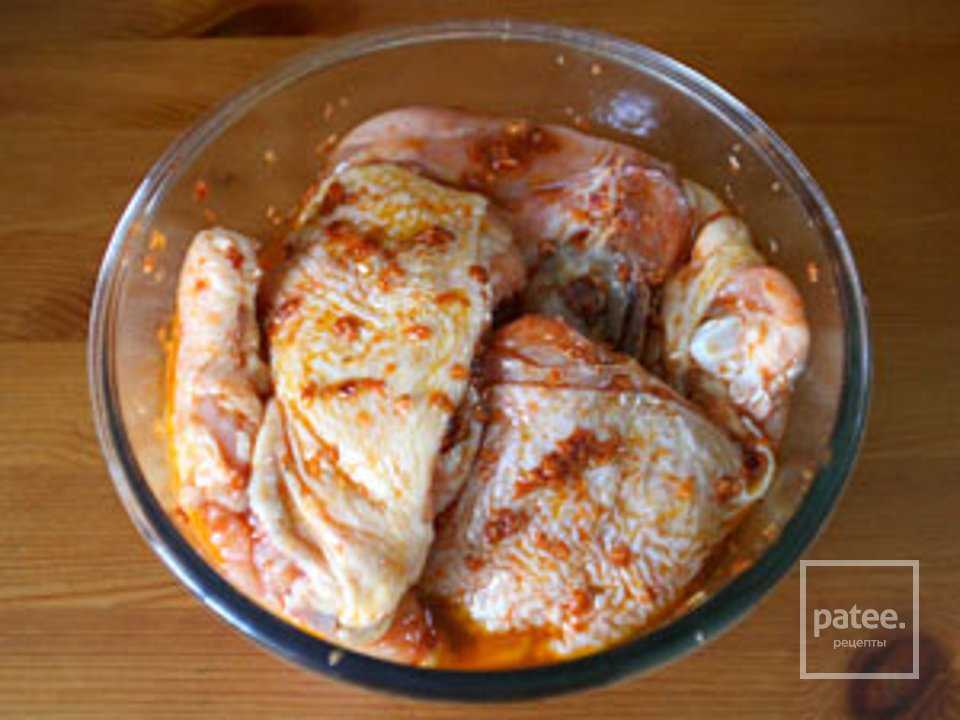 1. Сначала замаринуйте курицу, маринадов великое множество, можно кстати за основу взять любой, помните мы с вами уже делали такие для куриных шашлыков, там такое разнообразие, что выбрать можно любой. Ну, а можно пойти простым способом и натереть ее обычным перцем и солью.