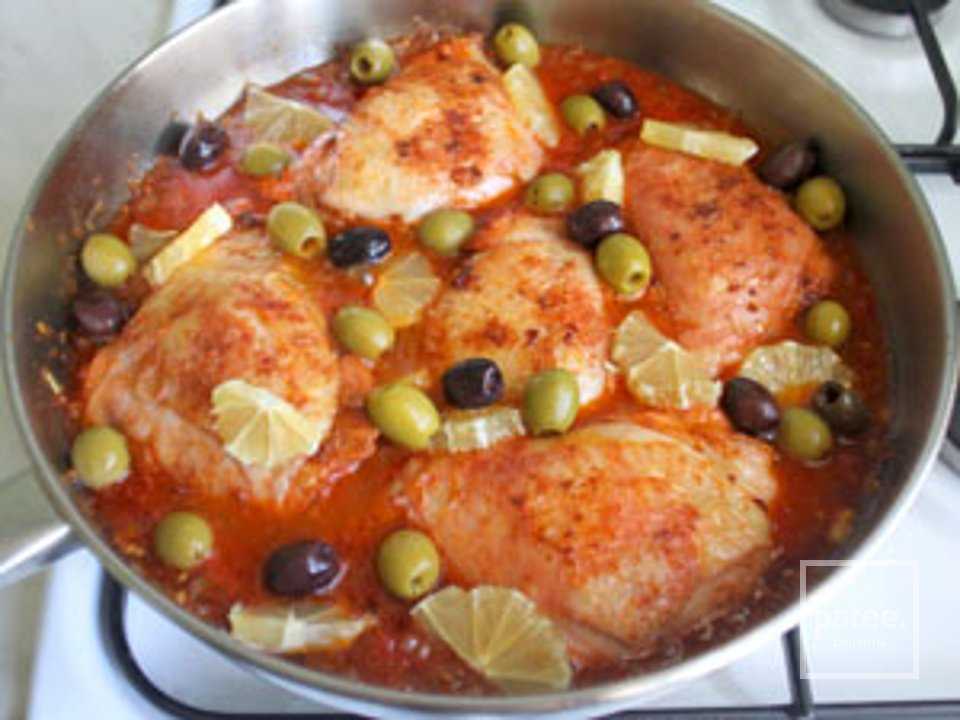 Следом выложить обжаренные куски курицы, добавить оливки и соленый лимон. Соус довести до кипения, при необходимости все досолить, накрыть крышкой и тушить на небольшом огне примерно 35 мин. до готовности курицы. Время от времени курицу следует поливать соусом, в котором она тушится
