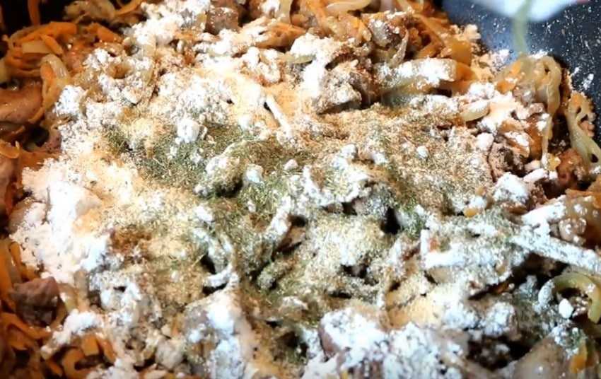 Затем в полуготовое блюдо бросают лук, перемешивают, добавляют немного воды, сметаны или майонеза и, накрыв крышкой, тушат на медленном огне.