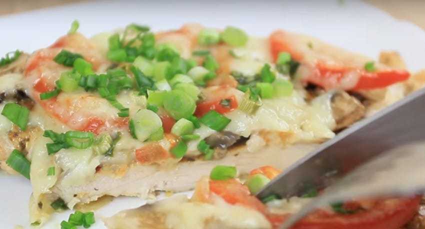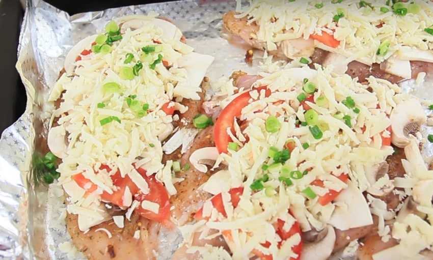 Куриные отбивные в духовке с помидорами, грибами и сыром
