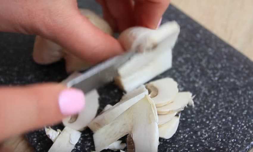 3. Нашинкуйте шампиньоны тонкими пластинами и нарежьте перья зеленого лука.