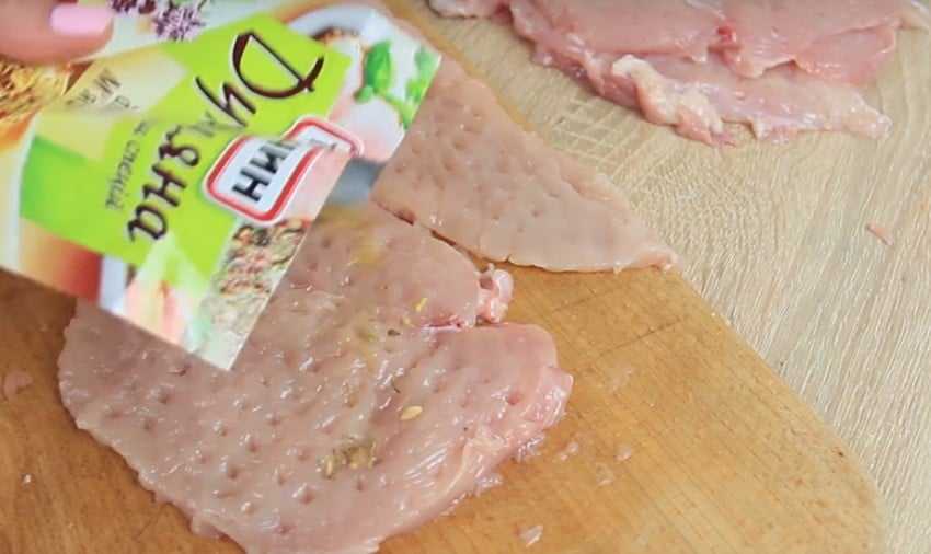1. Каждое филе разрежьте поперек на 2 части, хорошенько отбейте кухонным молотком. Щедро смажьте специями с обеих сторон и посолите. Удобно втирать их рукой. Оставьте курицу мариноваться в течение 10 минут.