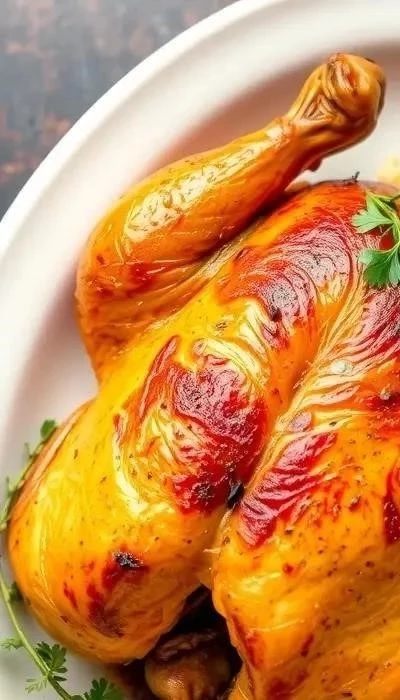 Шаг 3: Запекаем. Смазываем курицу растительным маслом, посыпаем специями. Запекаем в разогретой до 180°C духовке около 1,5-2 часов, периодически поливая выделившимся соком. Готовность проверяем по цвету корочки и соку, вытекающему при проколе.