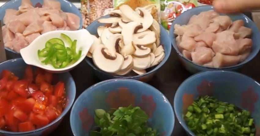 1. Нарежьте небольшими кубиками мясо и помидоры, грибы порежьте пластинами, перец соломкой. Порубите зеленый лук и базилик.