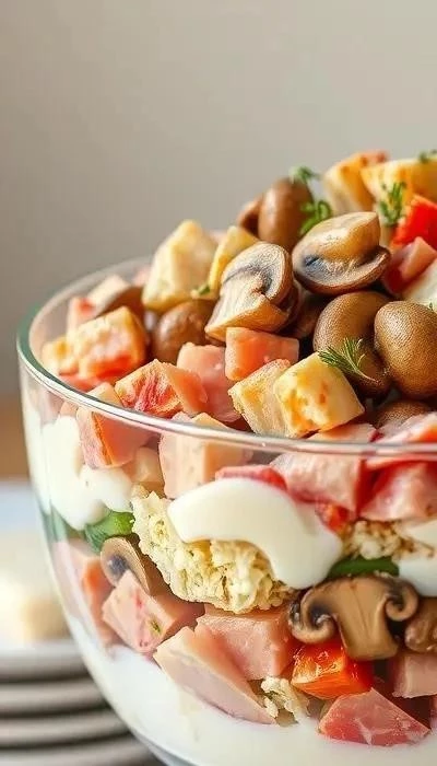 Салаты прошли эволюцию от простых травяных смесей до сытных блюд. Сочетание мяса, грибов и сыра является ярким примером этого пути. Оно зародилось в традициях европейской кухни, где ценились питательные и ароматные ингредиенты. Изначально это было скорее горячей закуской, но со временем трансформировалось в популярный холодный салат.