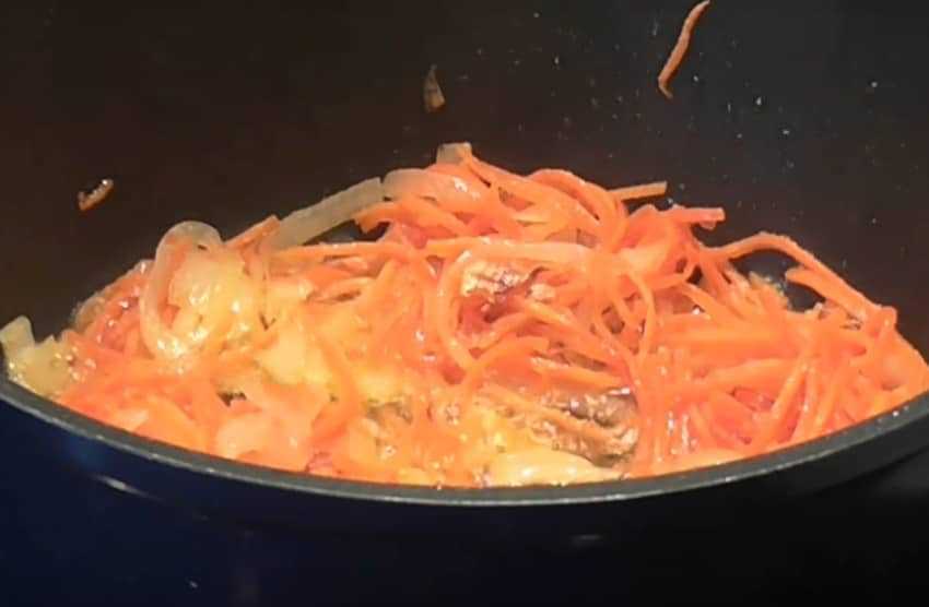 Подошло время прибавить шинкованную морковку. Она добавит сладкую нотку и смягчит привкус лука.