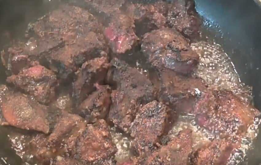- Вновь прибавляем огонь, добавляем кусочки говяжьей печени. Помешивая, дождаться, когда печень поменяет цвет. Теперь надо убавить огонь, накрыть крышкой и потушить 7−10 минут. Готовность ливера проверяем, разрезав кусочек. Если при разрезе нет кровянистого сока, значит она готова.