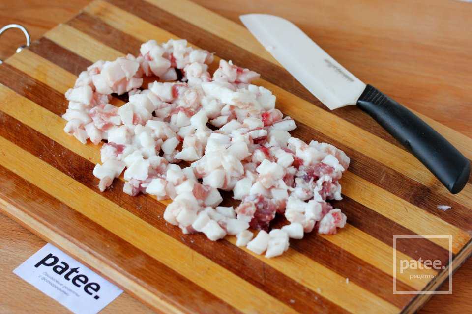 С сала снимаем кожу и нарезаем его мелкими кубиками.
