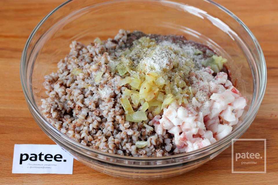 К перекрученной свиной печени добавляем гречку, жареный лук, нарезанное сало, соль и чёрный молотый перец.